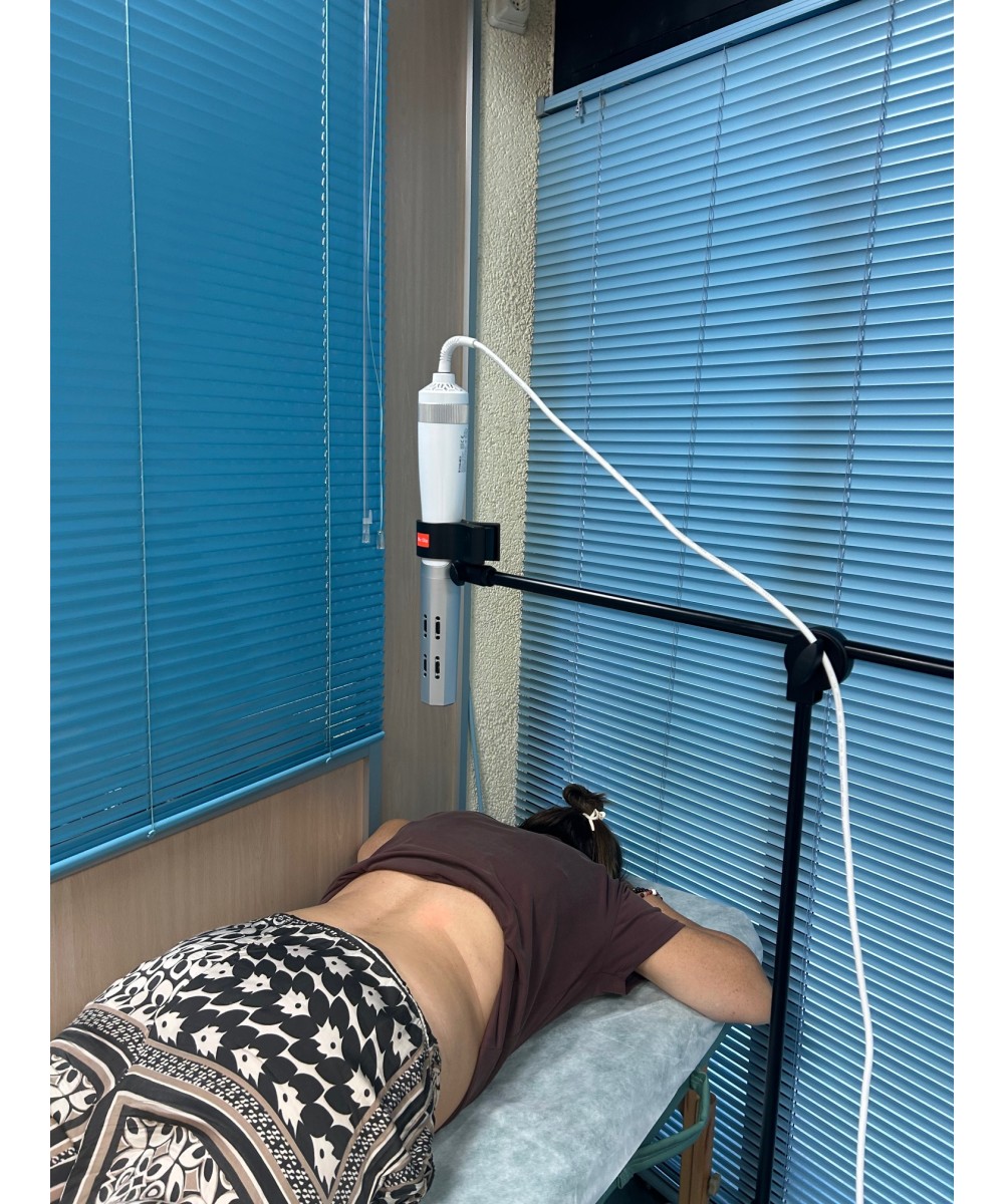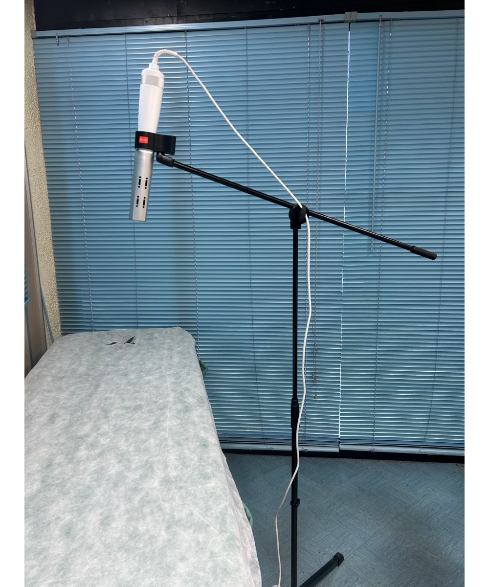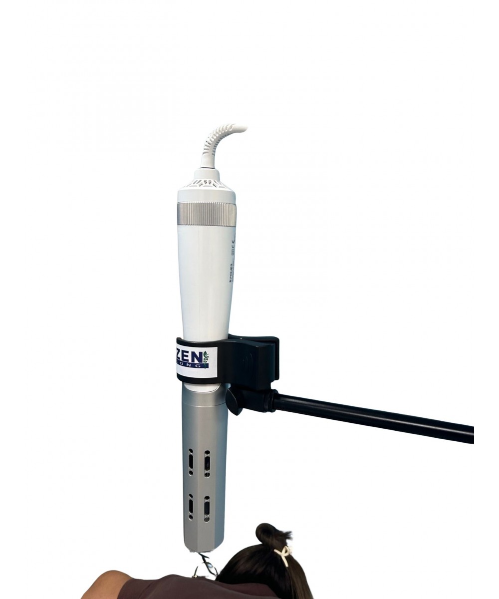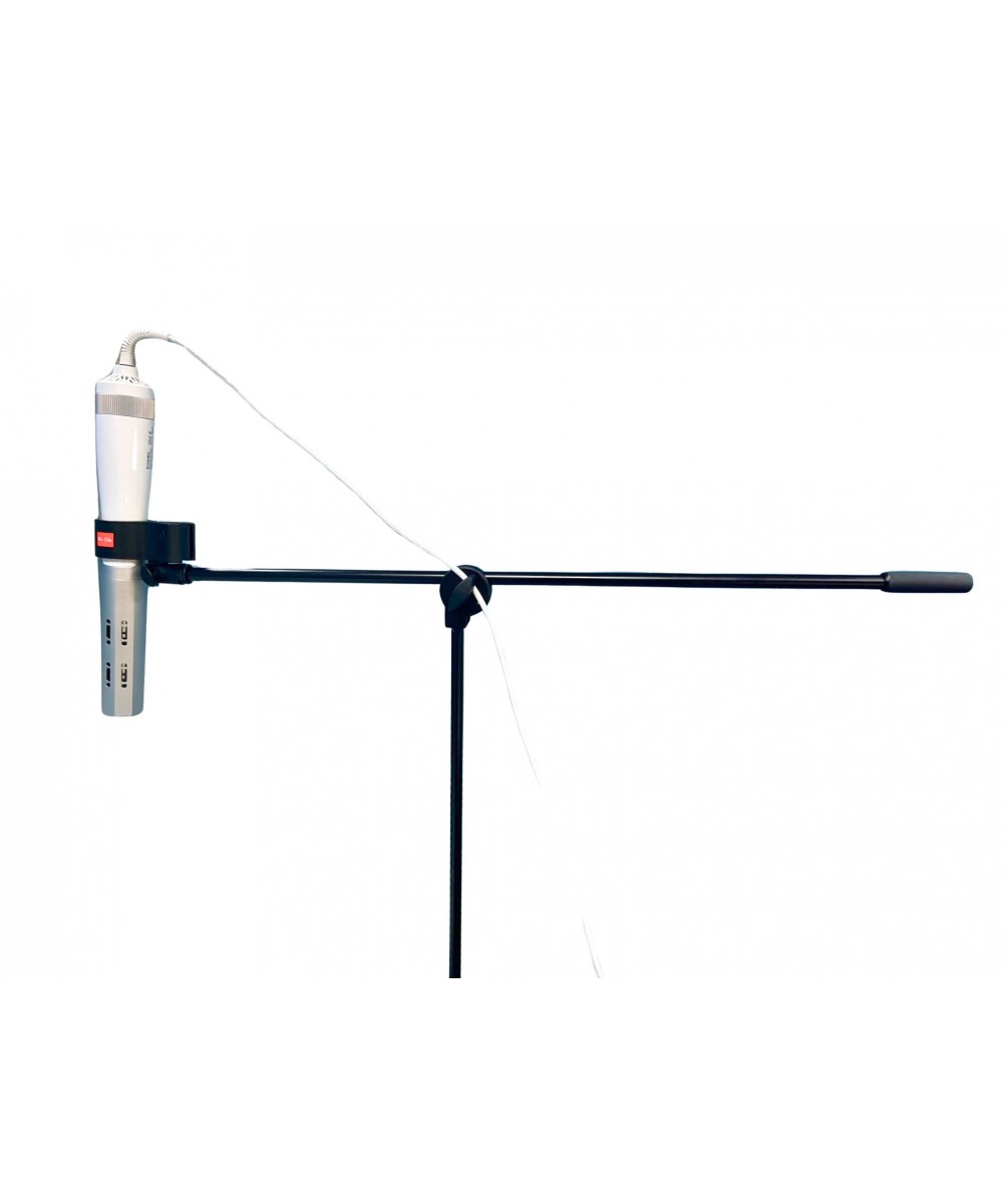 Pie soporte articulado con pinza de sujección para VPOWER en tratamientos prolongados.
