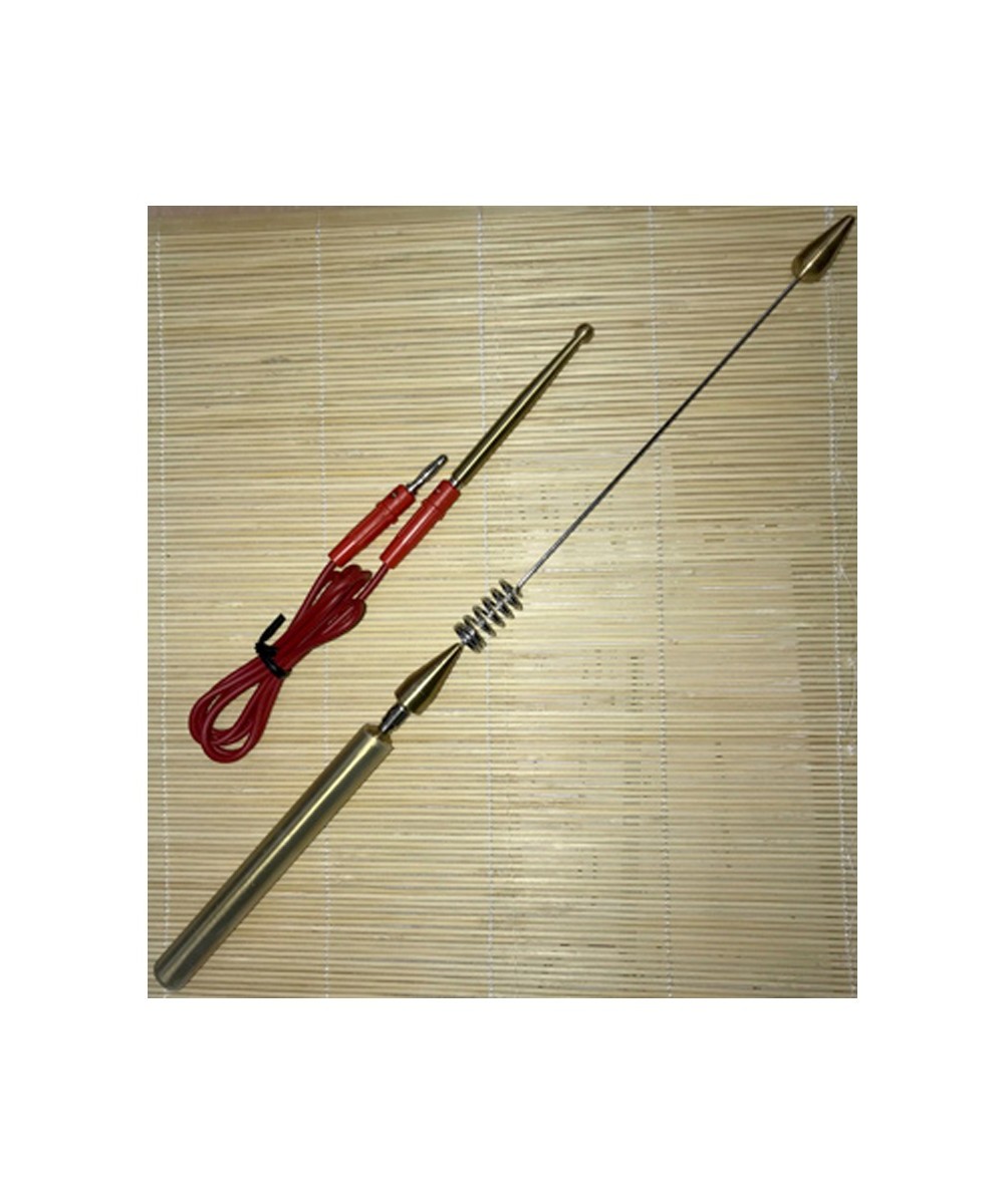 Tiene un cable unido al mango que sujeta el paciente como testigo para quien se está haciendo el diagnóstico, o para poner en contacto con el remedio.