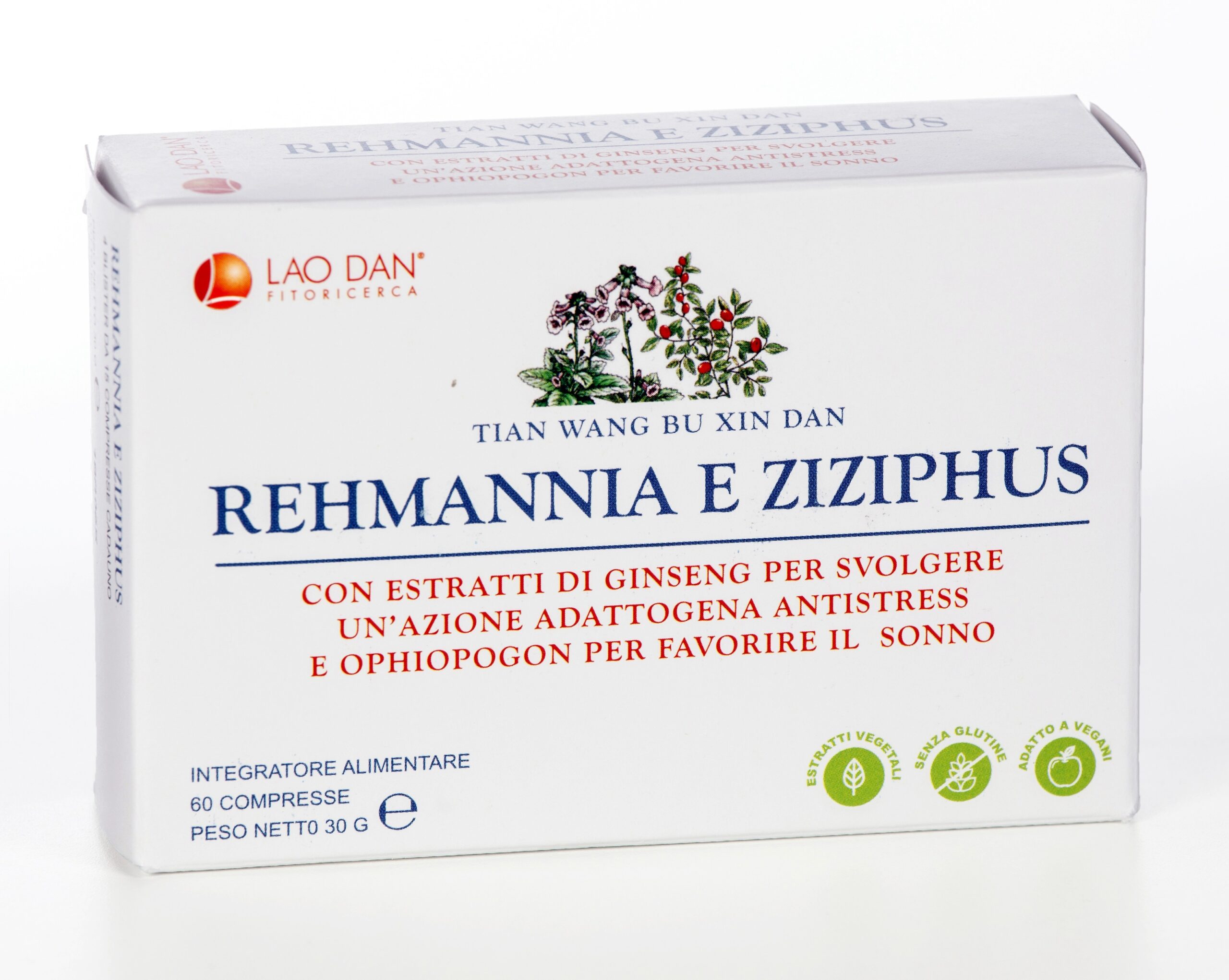 ATENCIÓN: la receta clásica incluye Jie geng (Platycodon grandiflorum, radix), Xuan shen (Scrophularia ningpoensis, radix) y Yuan zhi (Polygala tenuifolia, radix), cuya utilización está prohibida en los Complementos Alimenticios. Tales sustancias han sido excluidas de la fórmula LAO DAN y respectivamente sustituidas por Yu jin (Curcuma longa, radix), Mu dan pi (Paeonia suffruticosa, cortex radicis) y He huan pi (Albizia julibrissin, cortex).